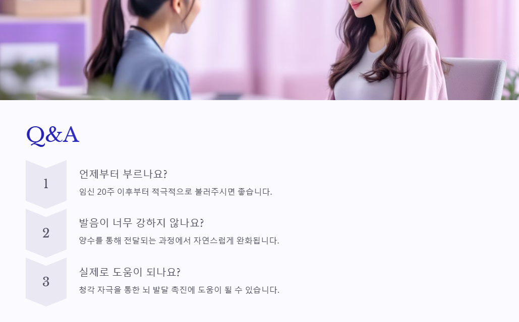 A: 청각 자극을 통한 뇌 발달 촉진에 도움이 될 수 있으며, 특히 태아와의 교감에 효과적입니다.
